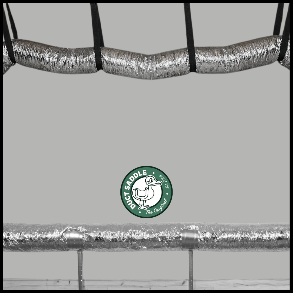 Standard straps act like a tourniquet, crushing insulation. The Duct Saddle provides a 6-inch wide steel cradle that maintains full duct diameter and airflow volume.